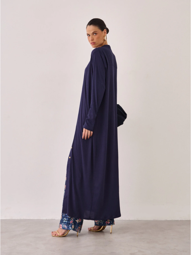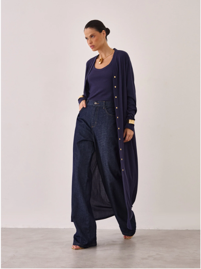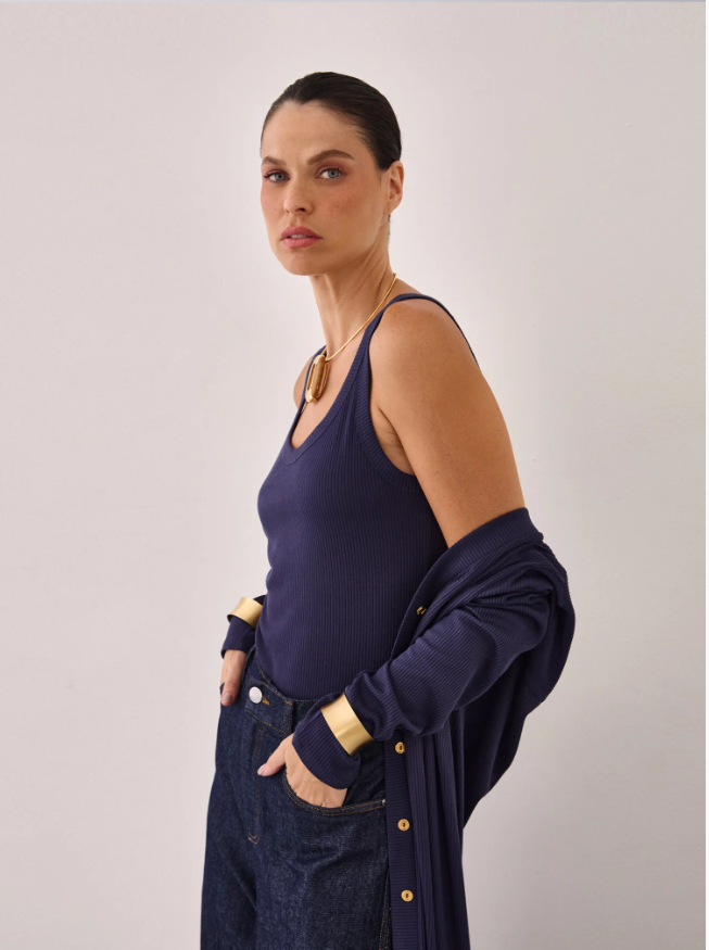 Este conjunto de regata e casaco azul marinho oferece sofisticação e conforto para looks versáteis. A regata ajustada e o casaco longo com botões dourados criam um visual moderno, perfeito para qualquer ocasião.