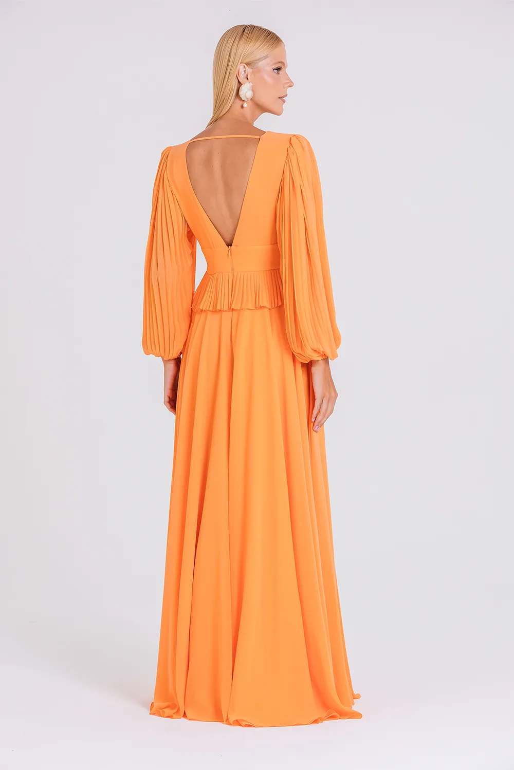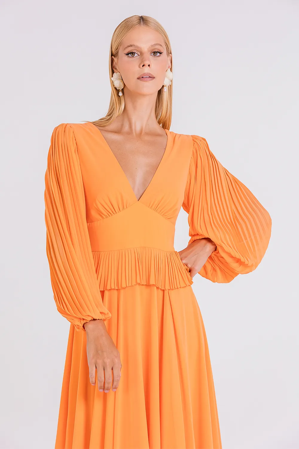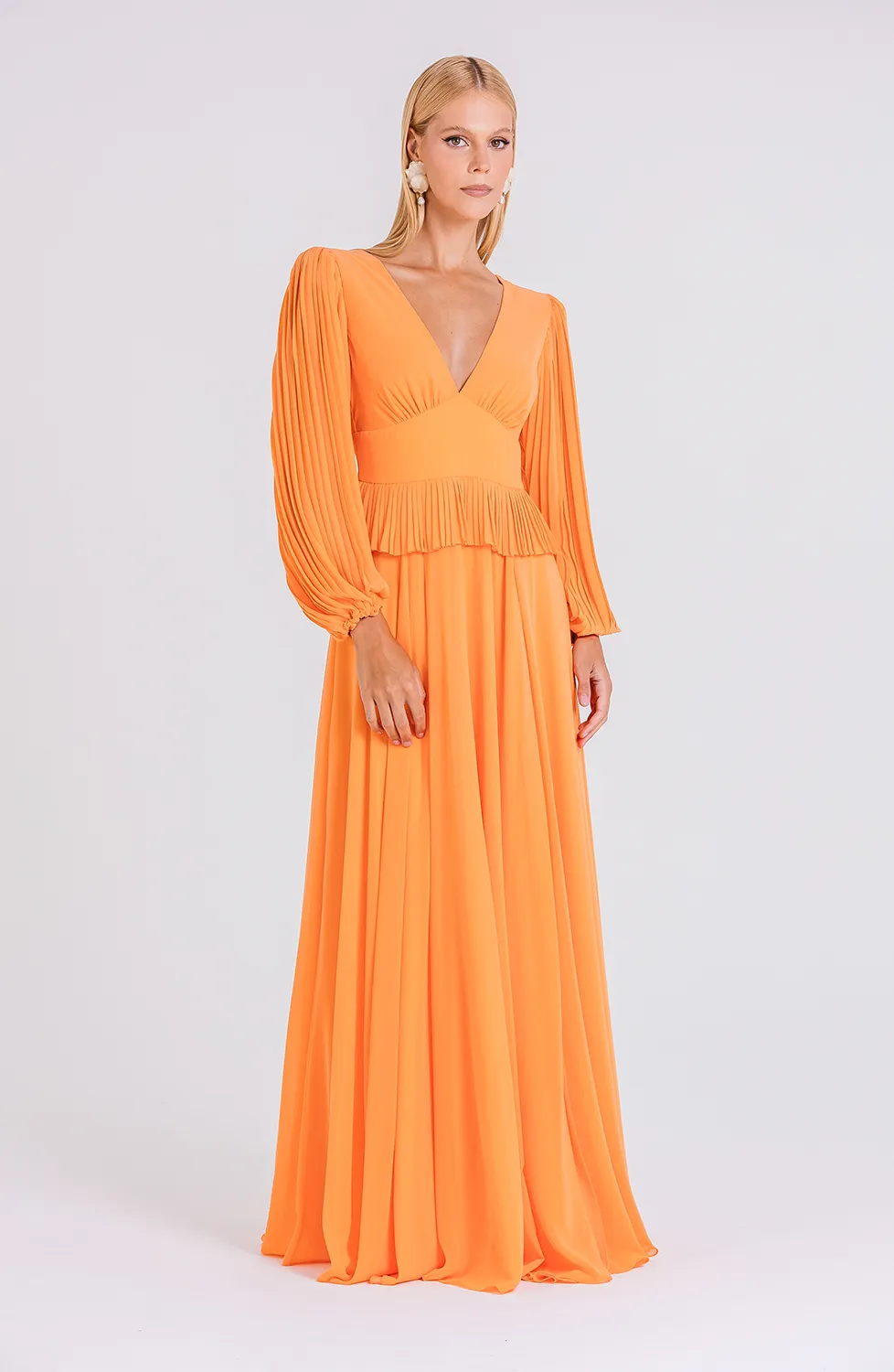 Sofisticado e solar, o VESTIDO SYLPRI é a escolha ideal para quem busca um look naturalmente sofisticado! Feito no leve tecido Silky Touch, ele apresenta uma modelagem longa com um movimento esvoaçante. O decote profundo em V e a cintura marcada com detalhe de babado destacam a feminilidade e elegância da peça. As mangas longas e plissadas acrescentam um toque de delicadeza, enquanto a fenda frontal traz um ar sensual e moderno.