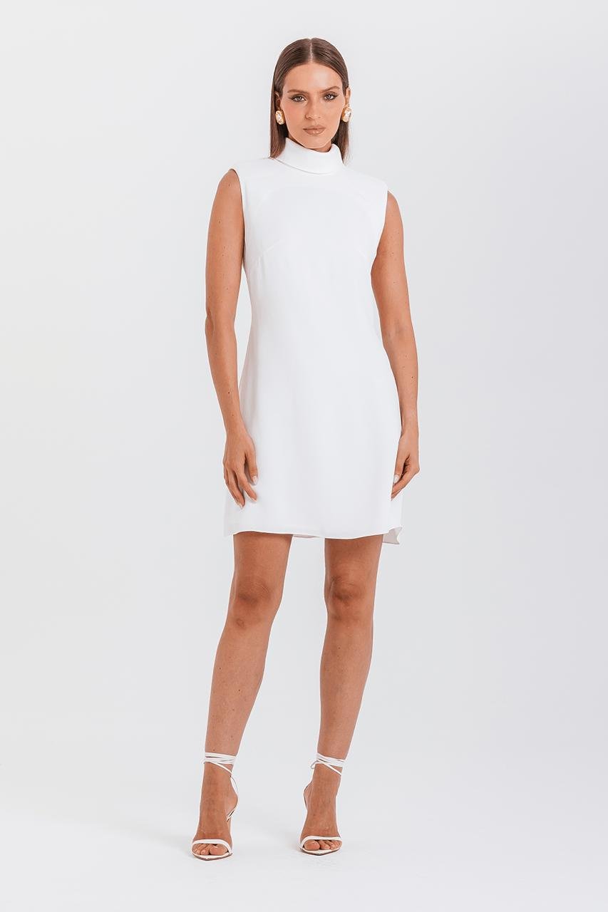 Feito em crepe acetato, com uma modelagem minimalista evasê, ombros marcados e sem mangas. Mas, o toque fashionista fica por conta do decote nas costas.